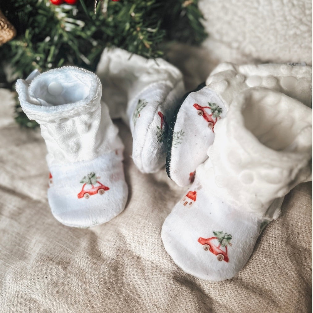 Des pantoufles en Minky qui tiennent bien dans les pieds tout en étant belles et chaudes c’est possible! Celles-ci sont offertes avec chevilles Minky blanc et motif de Noël aux orteils...