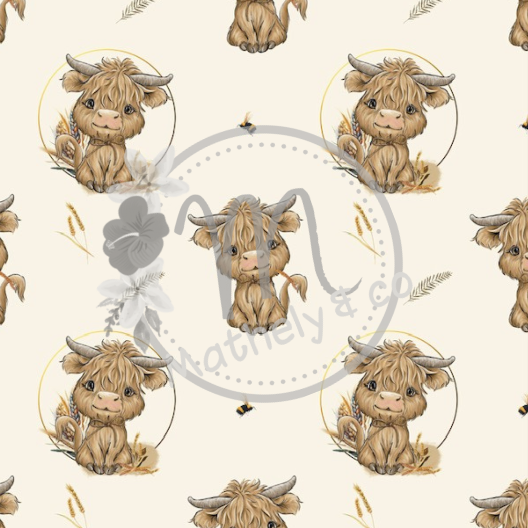 Minky ultra-doux a Motif de vache highland pour le dessus et minky relief bulles couleur caramel pour le dessous.