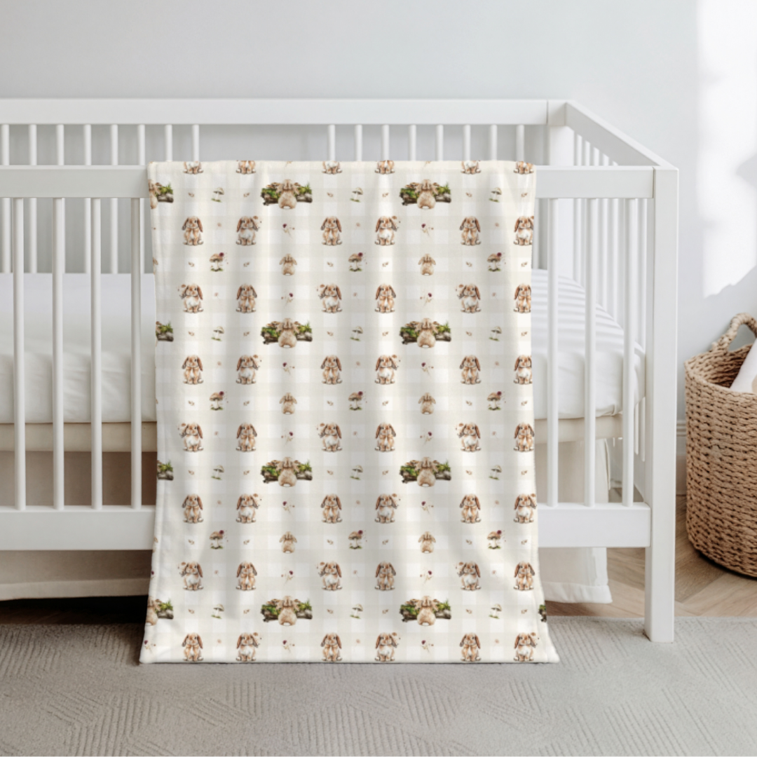 Minky ultra-doux a Motif de petites lapines pour le dessus et minky relief lisse rosewater pour le dessous.