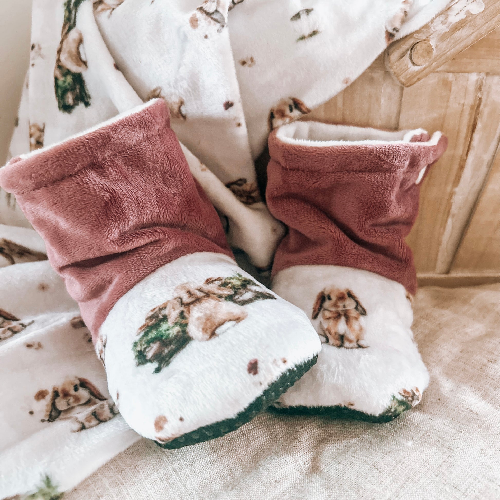 Des pantoufles en Minky qui tiennent bien dans les pieds tout en étant belles et chaudes c’est possible! Celles-ci sont offertes avec cheville Minky lisse rosewater et motif de petites lapines aux orteils...