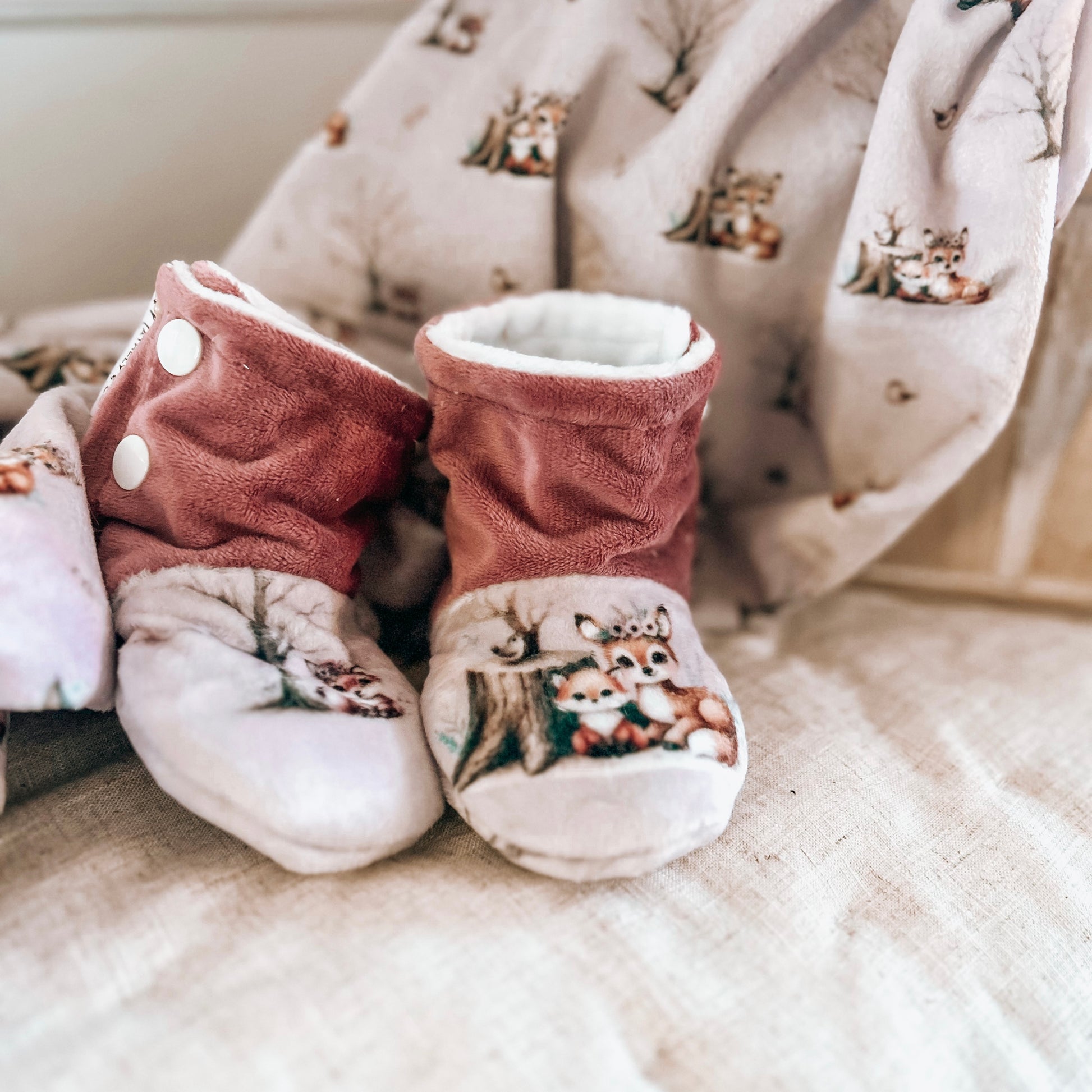 Des pantoufles en Minky qui tiennent bien dans les pieds tout en étant belles et chaudes c’est possible! Celles-ci sont offertes avec cheville Minky lisse rosewater et motif de petits renards aux orteils...
