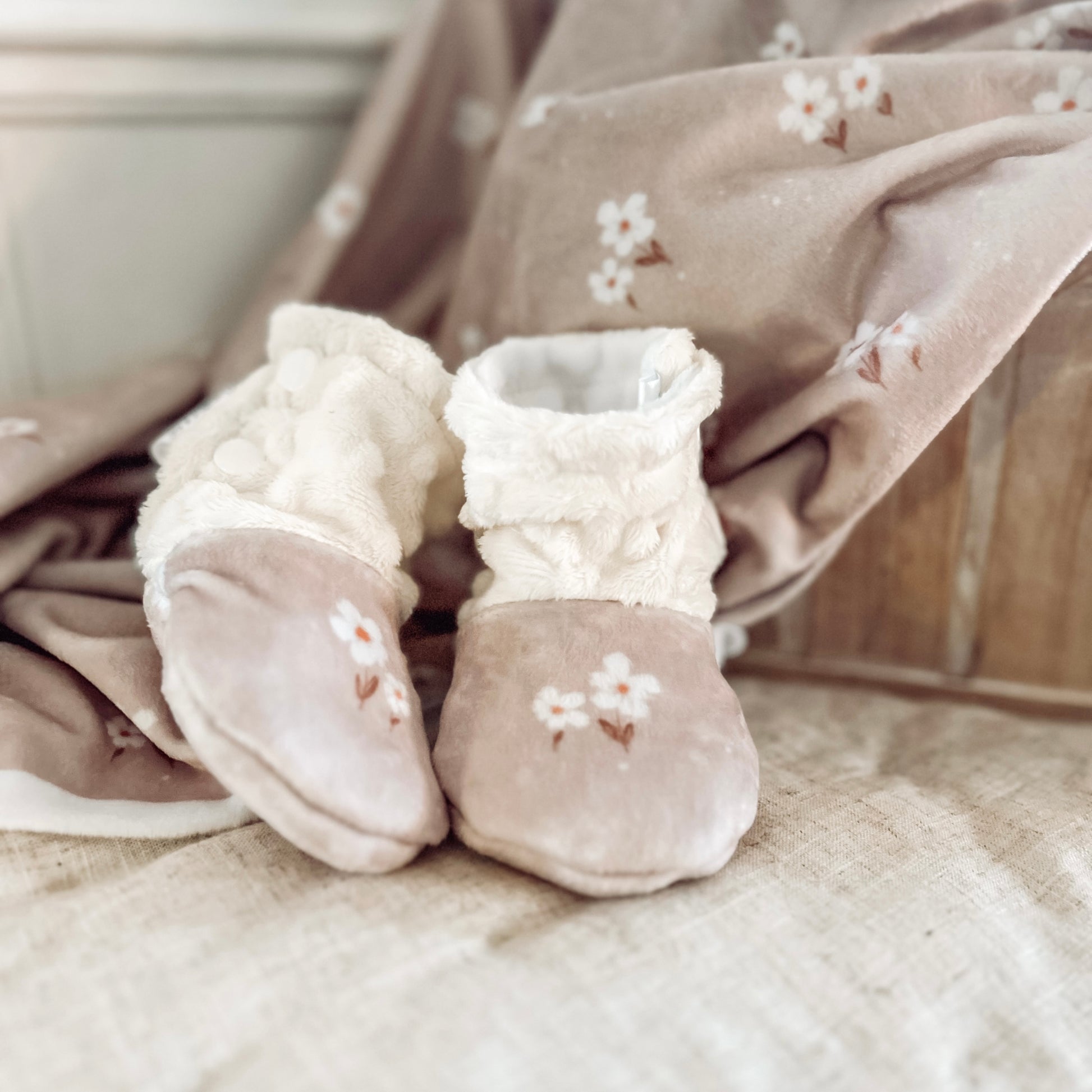 Des pantoufles en Minky qui tiennent bien dans les pieds tout en étant belles et chaudes c’est possible! Celles-ci sont offertes avec cheville Minky bulles crème et motif de petites fleurs aux orteils...