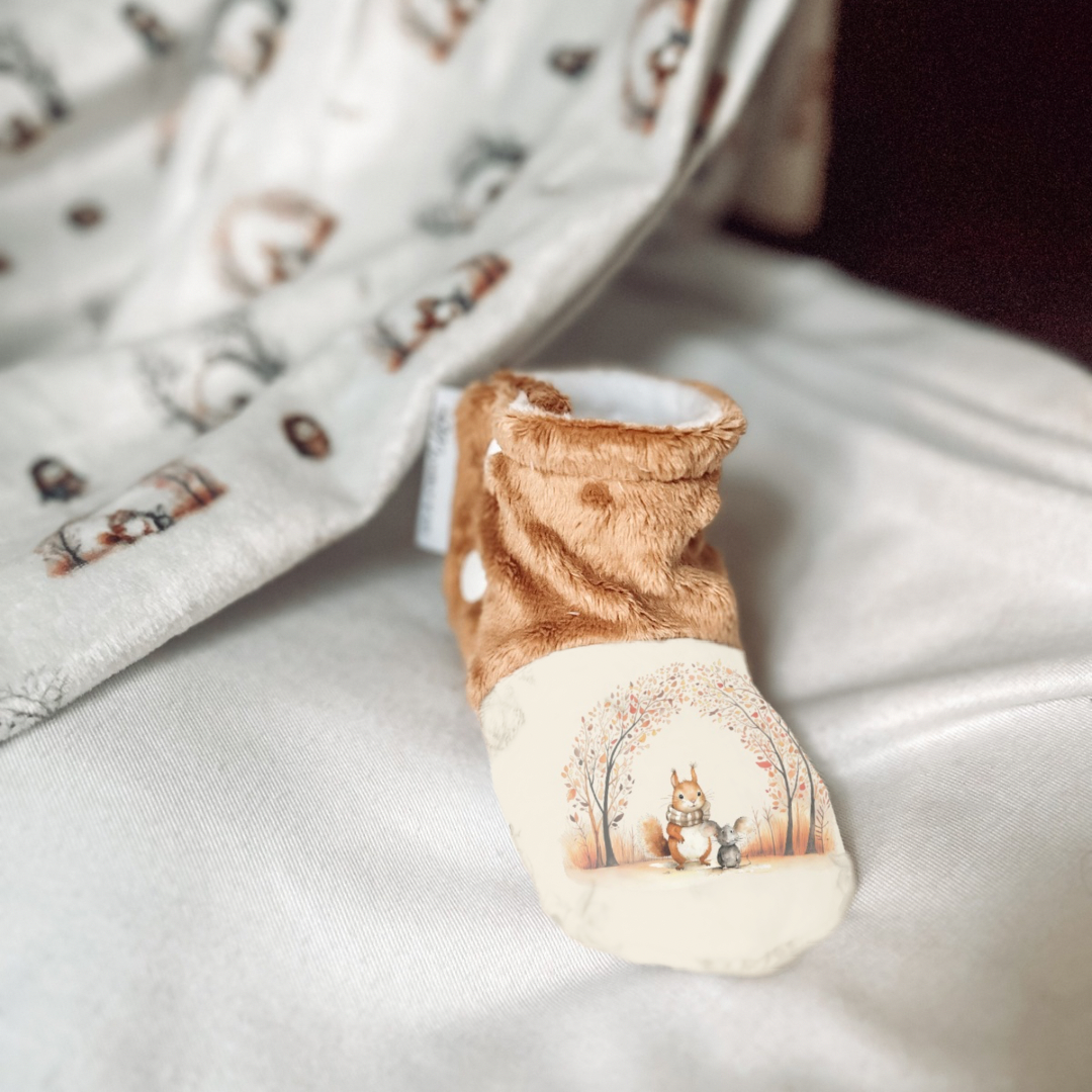 Vous avez 2 degrés d’ajustement aux chevilles grâce au 2 boutons pressions et pour les tailles 6-12 et + semelles antidérapantes s’y ajoute. Intérieure originale en Minky et semelle en Sherpa.