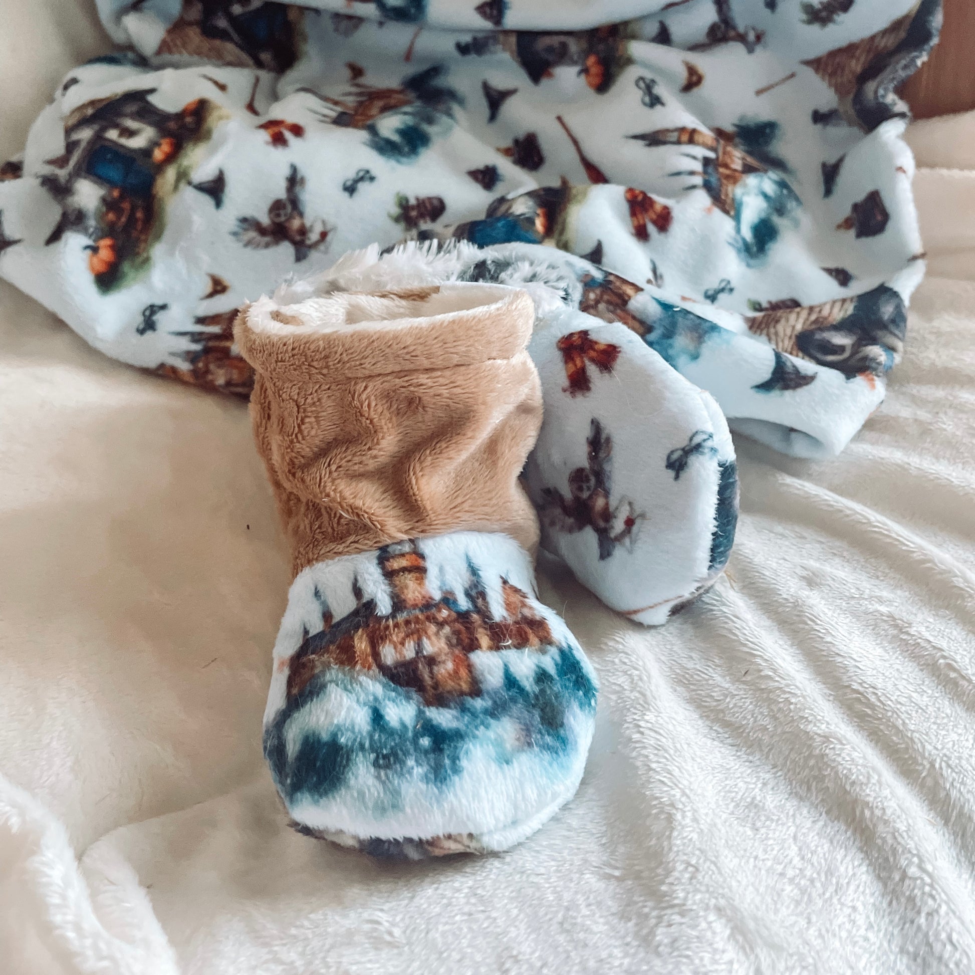 Des pantoufles en Minky qui tiennent bien dans les pieds tout en étant belles et chaudes c’est possible! Celles-ci sont offertes avec cheville Minky lisse caramel et motif de sorcellerie aux orteils ...